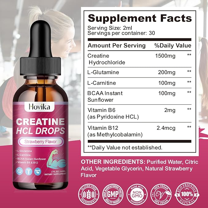 Creatine HCL Liquid Drops for Men & Women, Creatine Hydrochloride with L-Carnitine, L-Glutamine, BCAA, Vitamin B12 & B6 for Muscle Growth, Promote Energy & Recovery-Vegan, Strawberry Flavor, 2 Fl Oz