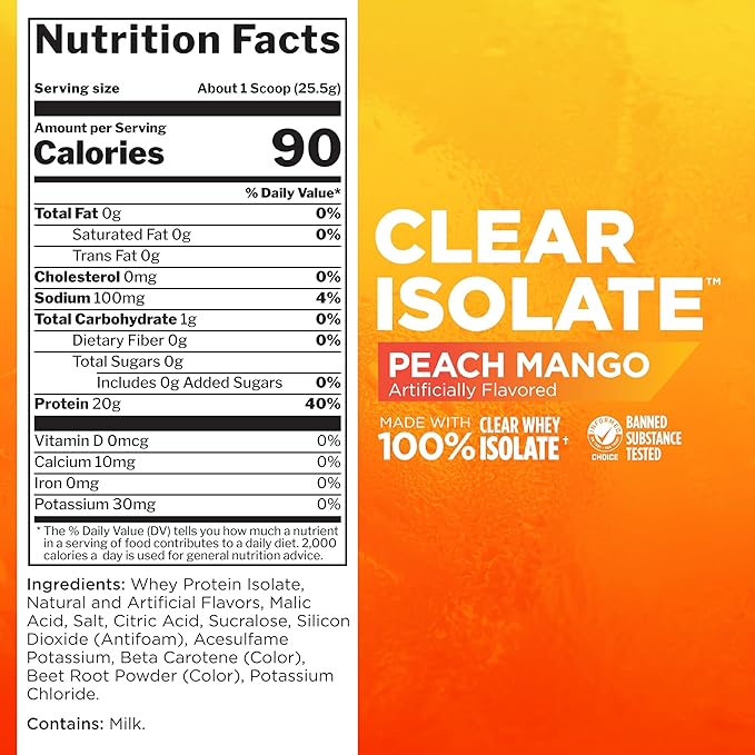 Rule 1 Clear Whey Isolate - 20g All-whey Isolate Protein, Over 9g EAAs, 300mg of Electrolyte Minerals, 90 Calories, Light, Crisp, and Refreshing Taste (27 Servings, Peach Mango)