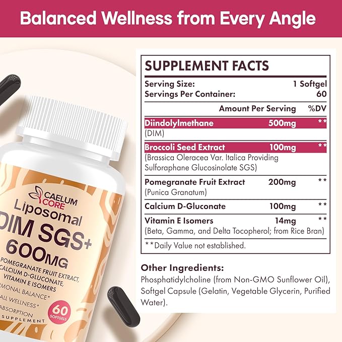- DIM Complex Supplement: Combines Pomegranate Extract, Calcium D-Gluconate, and Vitamin E Isomers for full-body health support. Pomegranate boosts immunity, Calcium D-Gluconate aids calcium absorption, and Vitamin E offers antioxidant benefits