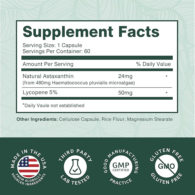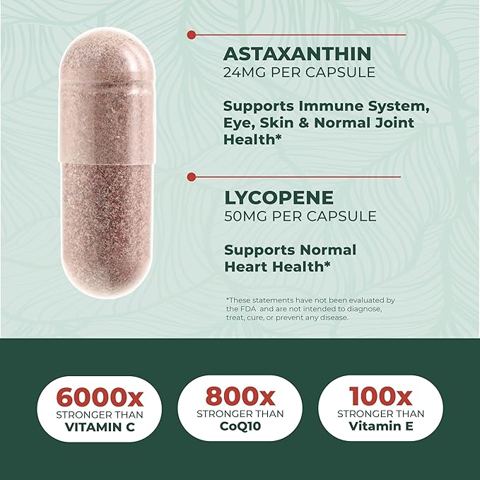- ENHANCED POTENCY FOR MAXIMUM BENEFITS: While most astaxanthin supplements contain only astaxanthin 12mg and lycopene 20mg, our astaxanthin lycopene supplement contains 2X the dose per capsule for immune system boost and overall well-being.*