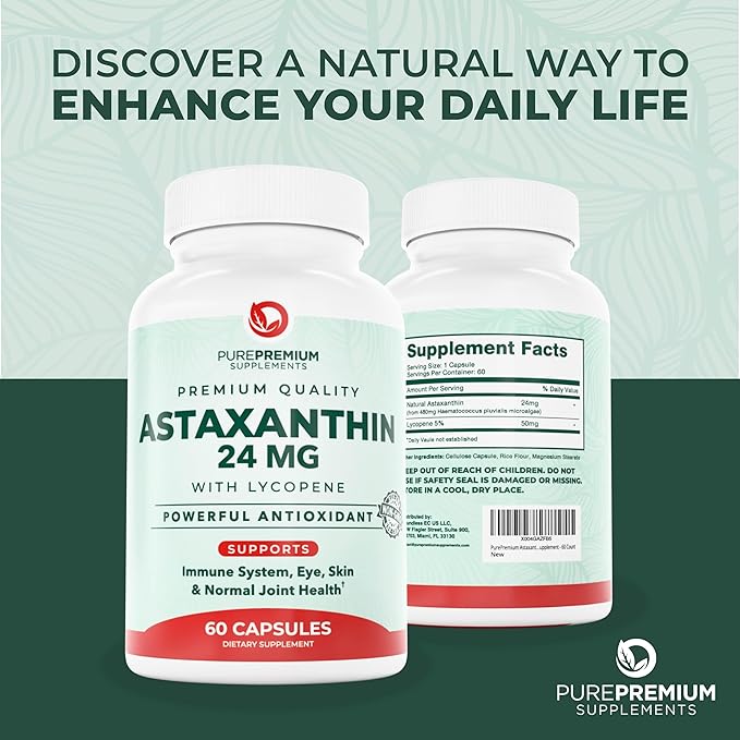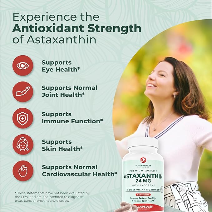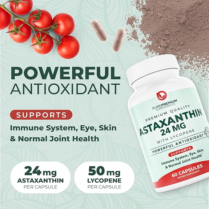 PurePremium Astaxanthin Supplements - Astaxanthin 24mg with Lycopene 50mg Antioxidants Supplement for Skin & Eye Health, Normal Joint Support & Immune System Support – Non-GMO - 60 Count