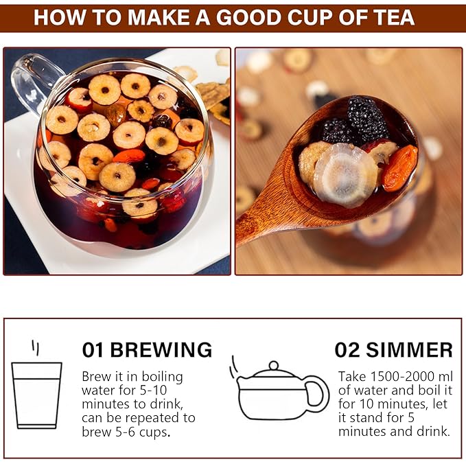 - 【Unique Taste】Ginseng Ten Treasures Tea has a mellow flavour with a sweet aftertaste. Ginseng has a strong aroma, accompanied by the sweetness of red dates and wolfberries. The tea soup has a deep colour, full of essence ingredients and good quality raw materials.