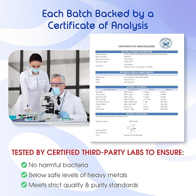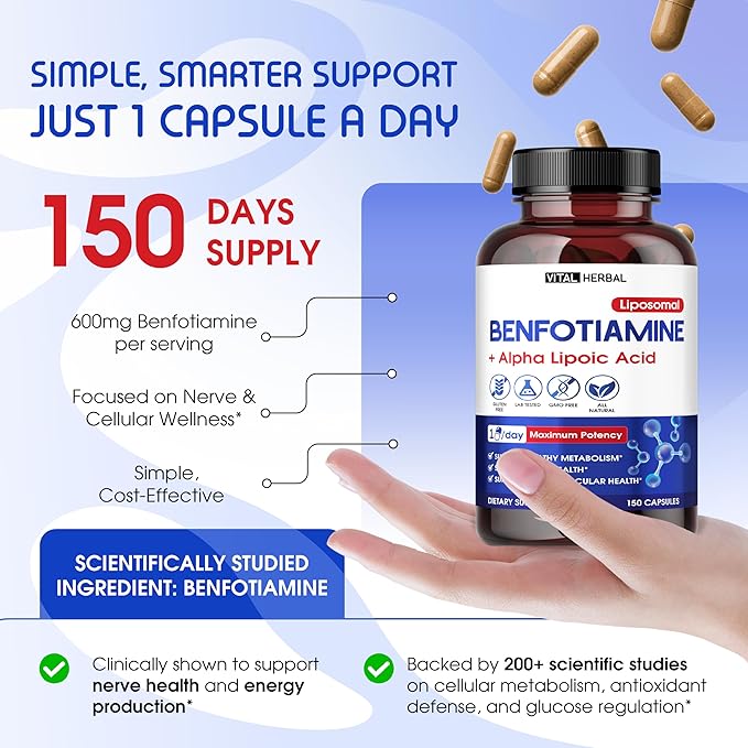 - Powerful Potency: Vital Herbal Liposomal Benfotiamine Supplements offer 150 capsules per bottle, providing a 5-month supply to support healthy metabolism and promote heart wellness