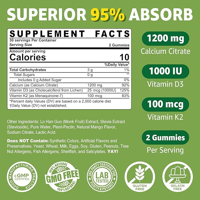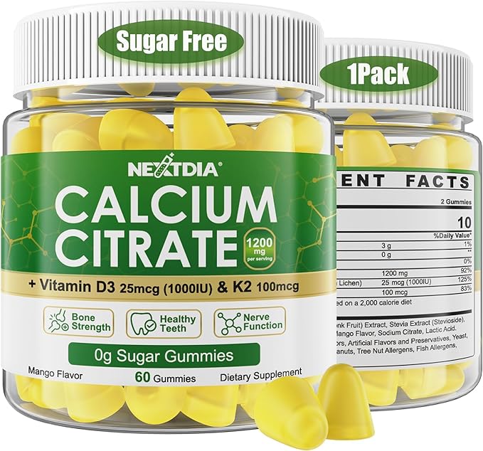 - SUGAR-FREE, CONVENIENT AND TASTY: Taking your daily calcium supplements has never been more enjoyable! Our calcium 1200 mg with vitamin d3 k2 gummies offer a natural mango flavor with no aftertaste. Low-calorie, easy to chew, and delicious, they’re a hassle-free alternative to tablets or capsules. Shelf-stable and no refrigeration needed. Chewable calcium gummies perfect for home, office, or travel—even as a best gift. Every chew provides essential nutrients for your bones!