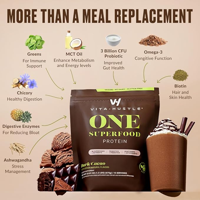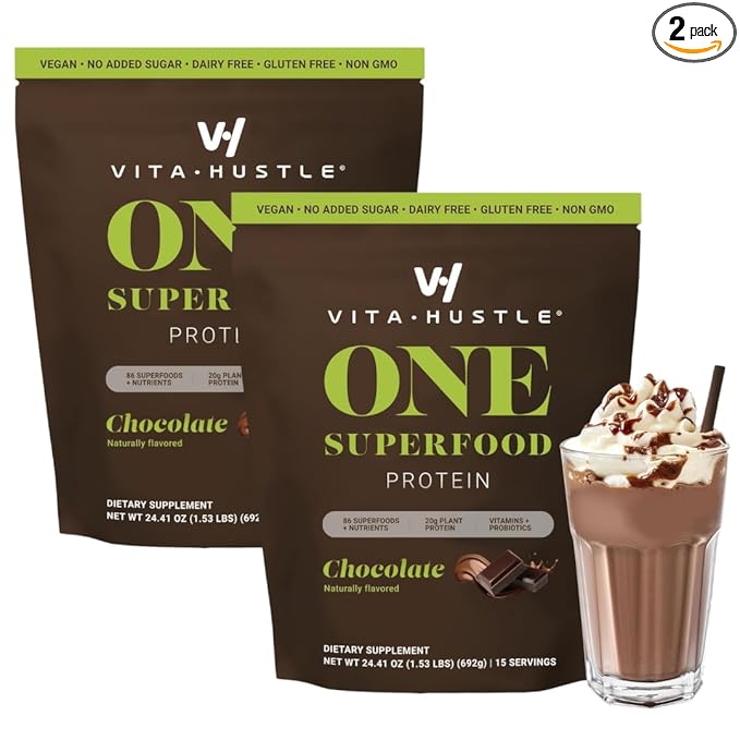 - SATISFYING & SUPER DELICIOUS – Filling without the fillers, silky-smooth and oh-so-satisfying, ONE by VitaHustle is never chalky or clumpy. Enjoy it blended over ice with water or plant-based milk, or add it to your favorite smoothie! Use it as a meal replacement, snack or after workout recovery shake.