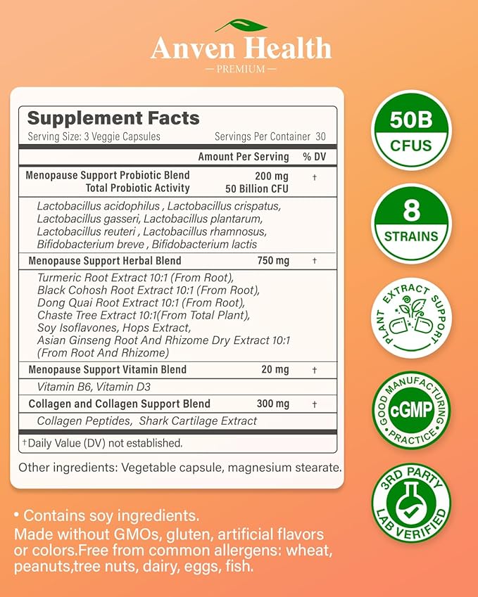 Menopause Supplements for Women,Vitamin D3 & B6,Menopause Probiotics Relief, Supports Hot Flashes, Night Sweats, Bloating & Gut Health with Herbs, Collagen Peptides | 270 Veggie Caps