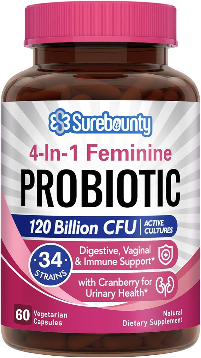 - Highest Potency for Women: Surebounty’s 1 veggie capsule comes in 4 powerful ingredients - 120 billion probiotics, raw prebiotics, natural enzymes, and organic cranberry extract - all specially designed to tailor to women’s specific needs with HIGHEST POTENCY available in the market.* This non-constipation formula supports digestive health, vaginal health & urinary health.* Take ONE capsule daily, Feel Relieved, Cleansed, Lifted & Strengthened with Surebounty 4-IN-1 Feminine Probiotic.