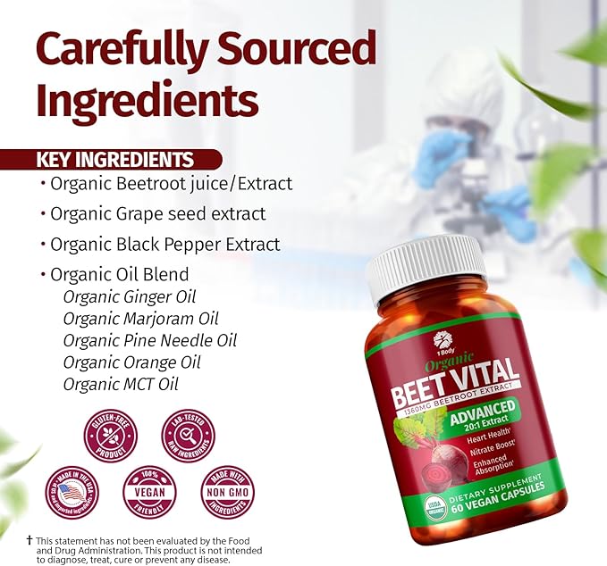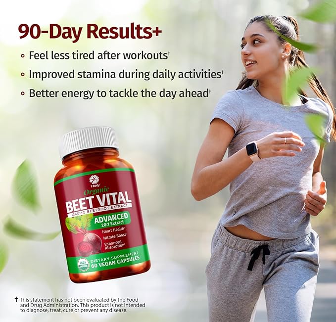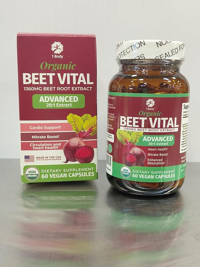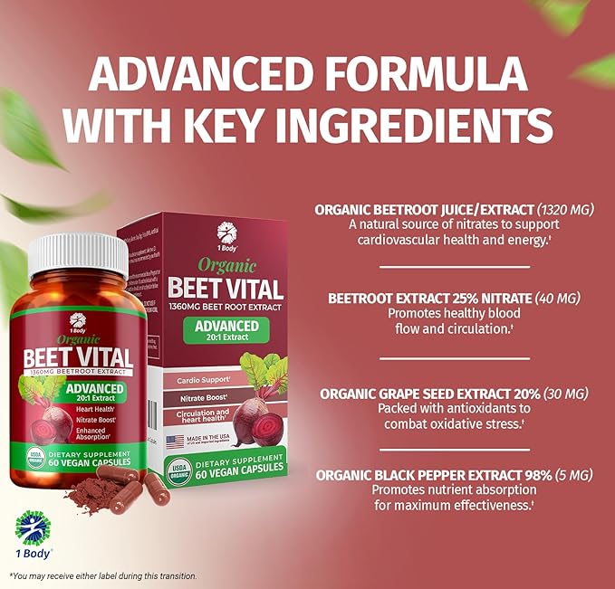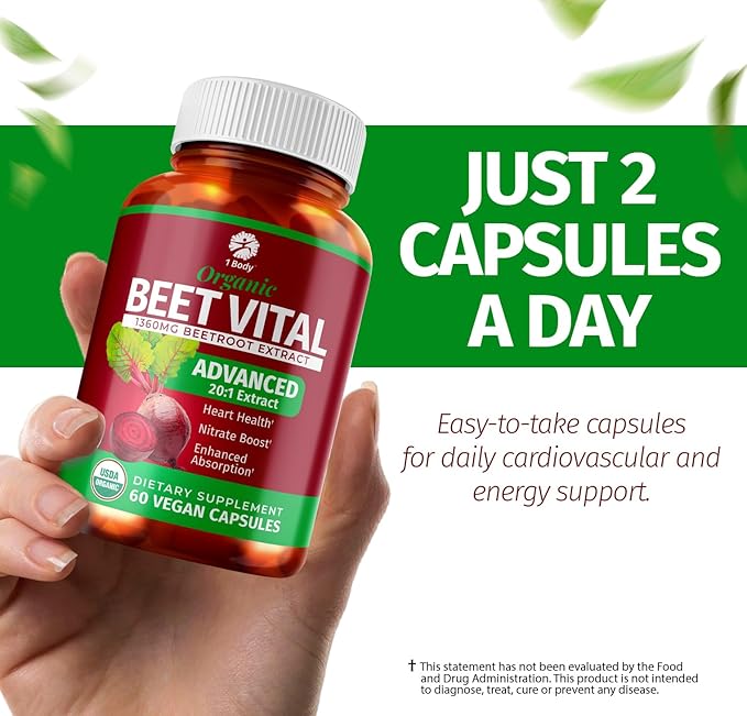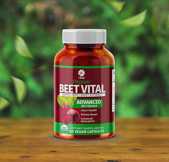 1 Body Beet Vital, Organic Beet Root Supplements for Circulation, Energy, & Stamina, Nitric Oxide Booster Beets Supplements with 1360mg Beetroot Extract, Vegan, Non-GMO, 60 Beetroot Capsules