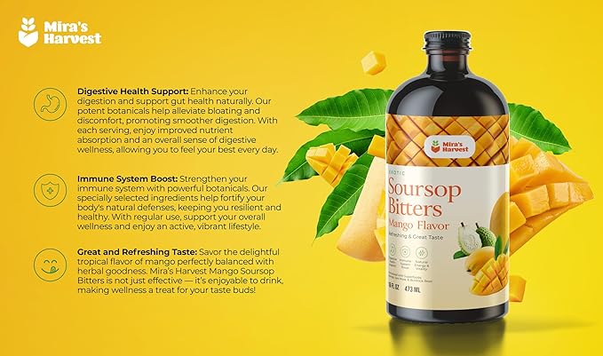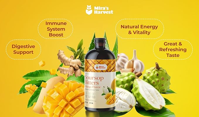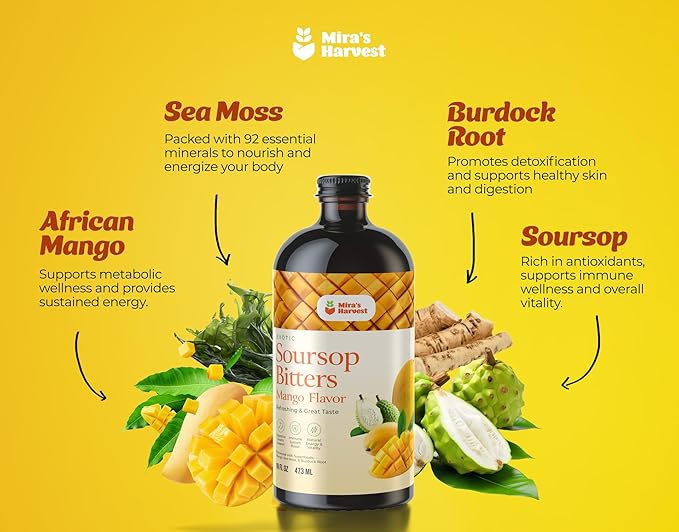 Mira's Harvest Soursop Bitters Liquid Mango Flavor, Premium Grade For Immune Boost, with Irish Moss, Burdock Root, African Mango 16oz