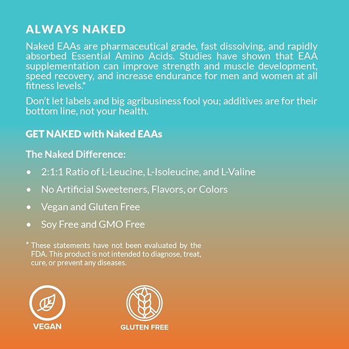 - PURE ESSENTIAL AMINO ACIDS: Naked EAAs is the highest pharmaceutical grade and fastest dissolving amino acids powder on the market. With pure ingredients, our amino acid supplement has been designed to support your performance in the gym.