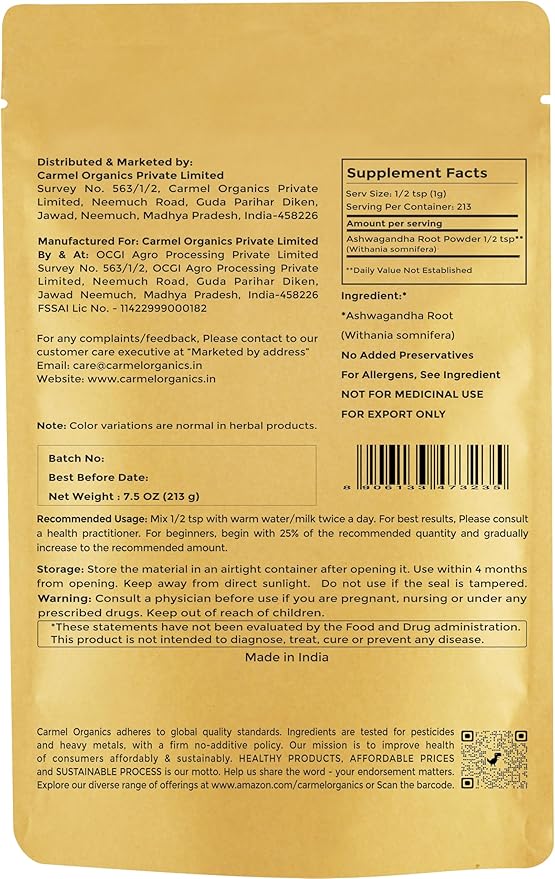 CARMEL ORGANICS Ashwagandha Root Powder 7.5 Ounce, Non GMO & Gluten Free, Natural, Withania Somnifera from India, No Added Presrvatives