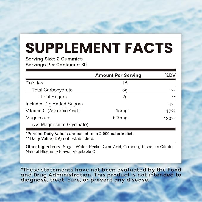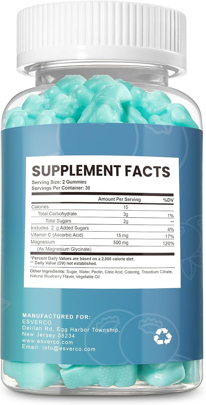 - [MAGNESIUM GLYCINATE GUMMIES] These magnesium gummies provide adults with good sleep and muscle health in a delicious way. The magnesium supplement has magnesium glycinate 500mg, and vitamin C 15mg. 2 gummies a day for a better night's sleep.