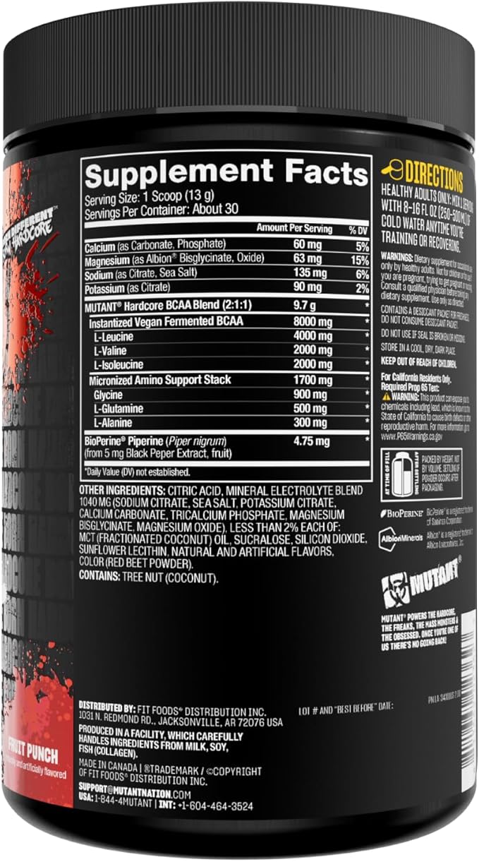 Mutant Hardcore BCAA - Pre, Intra or Post Workout – BCAA Next Level branched-Chain Amino Acids Supplement – Hydration + Recovery - 30 Serving - Fruit Punch