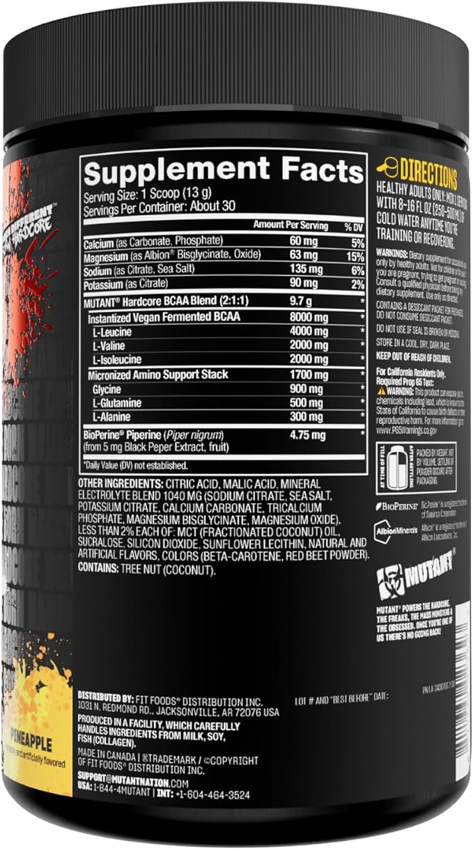 Mutant Hardcore BCAA - Pre, Intra or Post Workout – BCAA Next Level branched-Chain Amino Acids Supplement – Hydration + Recovery - 30 Serving - Pineapple
