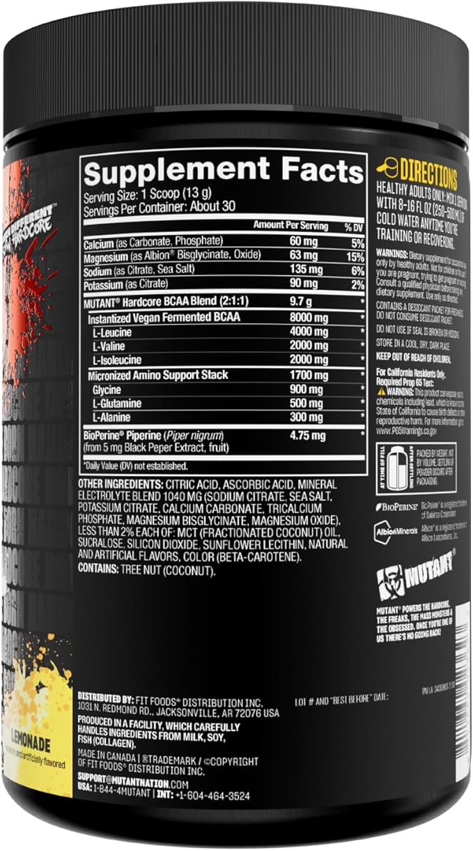 Mutant Hardcore BCAA - Pre, Intra or Post Workout – BCAA Next Level branched-Chain Amino Acids Supplement – Hydration + Recovery - 30 Serving - Lemonade