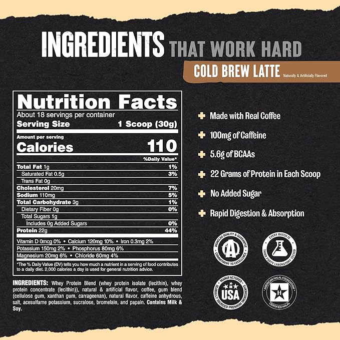 Animal Whey Protein Coffee Powder, Loaded with 22g of Protein, 100mg of Caffeine, and BCAAs for Pre & Post Workout Muscle Builder Recovery with Digestive Enzymes for Men & Women, Cold Brew Latte, 1 lb