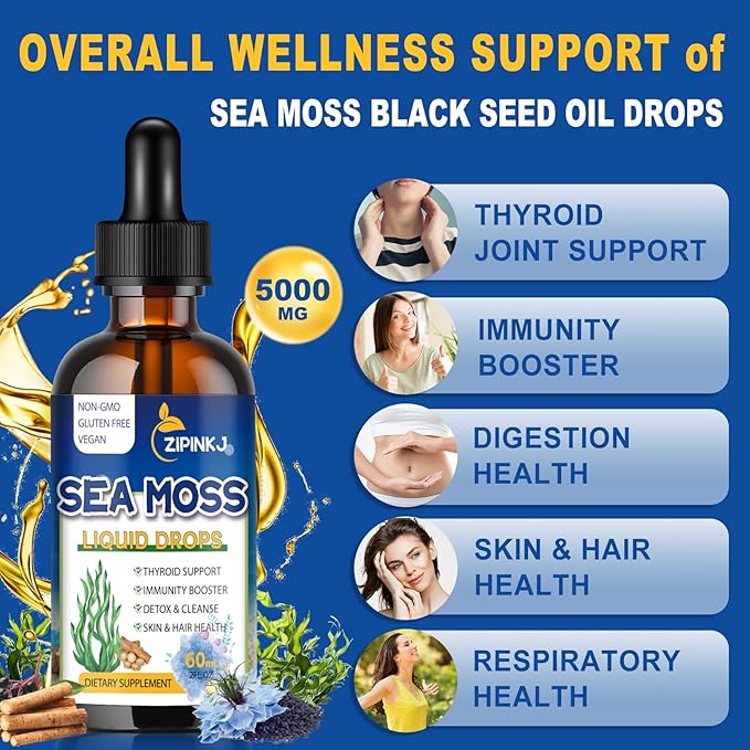 - Immune Health: Upgraded sea moss drops contain essential nutrients Vitamin D3 and Vitamin C. They help promote calcium absorption, support muscle health, improve life and boost immunity. Our sea moss & black seed oil liquid drops is non-GMO, gluten-free, 100% vegan and suitable for all lifestyles