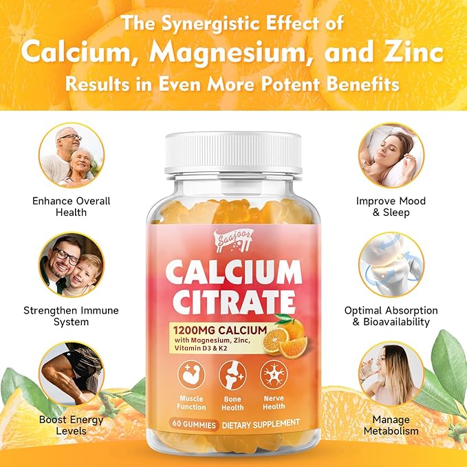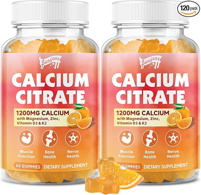 Calcium Citrate Gummies 1200 mg with Vitamin D3, K2, Magnesium, Zinc, Bone Support for Bones, Muscles & Joints,Immunity & Memory Support, 120 Count