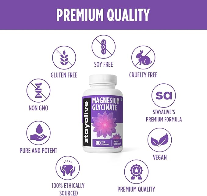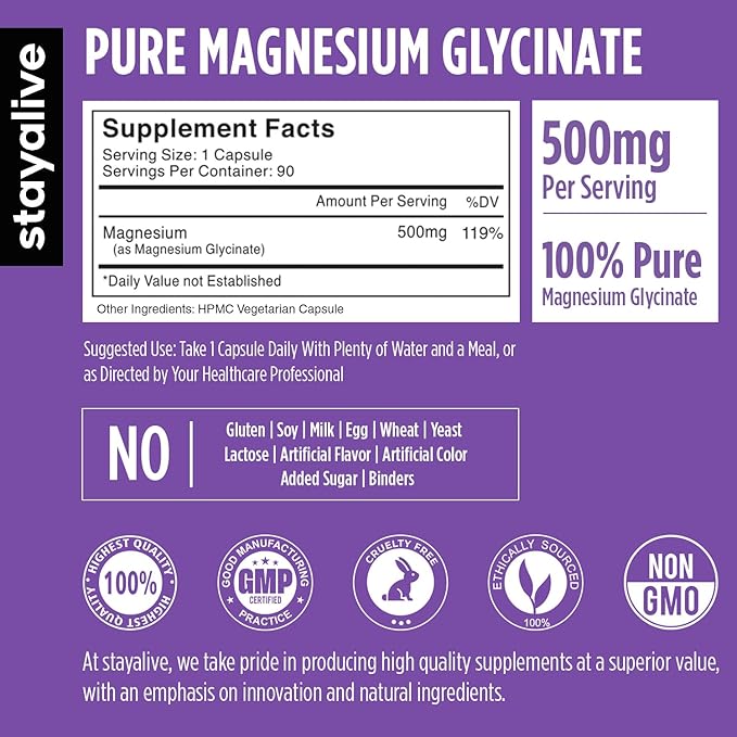 STAY ALIVE Chelated Magnesium Glycinate 500mg, High Absorption, 90 Capsules, 100% Pure Glycinate Powder, Extra Strength Magnesium Supplement for Women and Men, Non-GMO & Gluten Free Pills