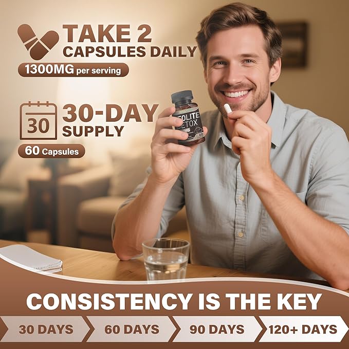 - ⛳ High-Potency 1300mg Detox Blend: Each serving delivers a powerful 1300mg proprietary blend of ultra-fine Clinoptilolite zeolite (1–2 µm), organic activated charcoal, and premium bentonite clay—key ingredients known for binding heavy metals and adsorbing toxins. Enriched with turmeric and black pepper for enhanced nutrient absorption, plus probiotics to support digestive health, this formula provides a comprehensive, science-backed detox for optimal wellness in both women and men.