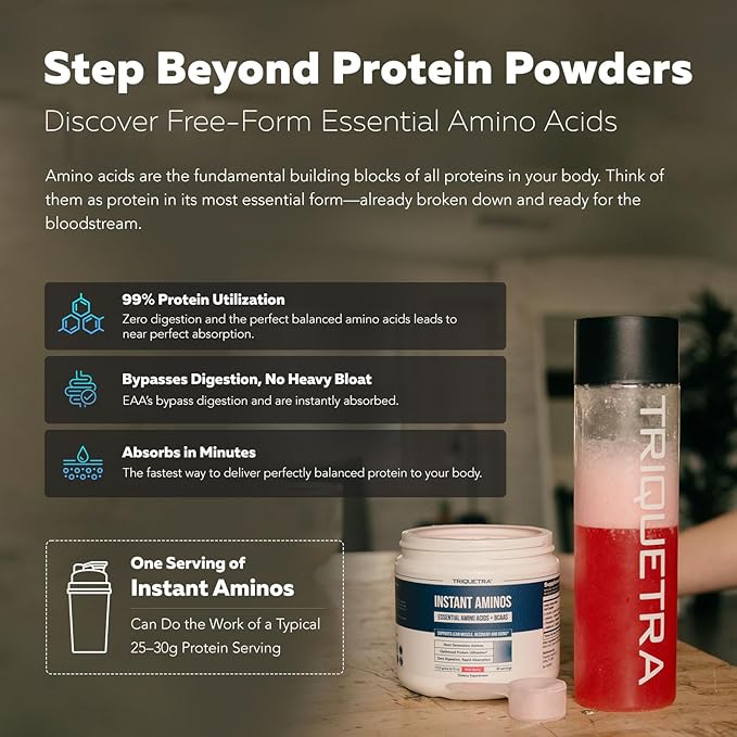 - Free-Form EAAs, The Future of Protein: Traditional proteins are outdated - they require digestion & have low absorption. Instant Aminos uses 100% free-form amino acids in the perfect ratio offering superior bioavailability & faster muscle recovery.