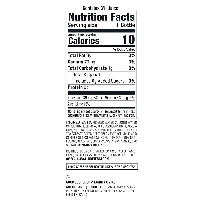 - NO ARTIFICIAL SWEETENERS: Bai water beverages are sweetened with stevia and contain no artificial sweeteners.