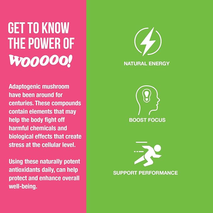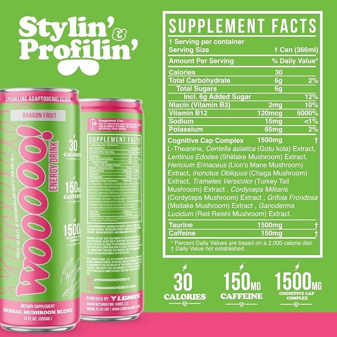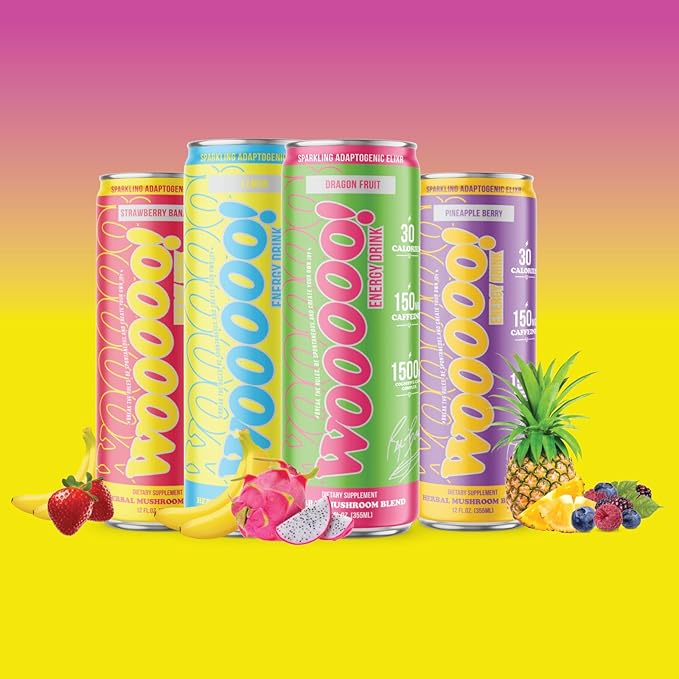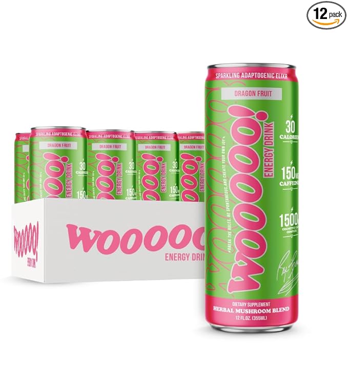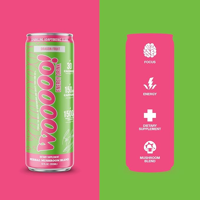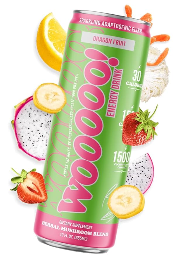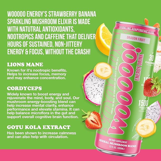 - FEEL THE WOOOOO!: Experience a powerful blend of proven ingredients that will put the WOOOOO in your day! WOOOOO Energy’s Sparkling Mushroom Elixir is made with natural antioxidants, nootropics and caffeine that deliver hours of sustained, non-Jittery energy & Focus but WITHOUT THE CRASH!
