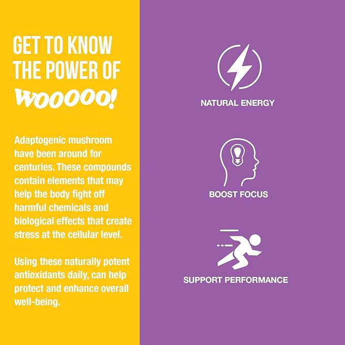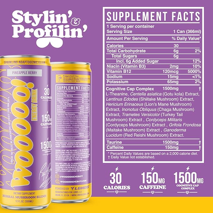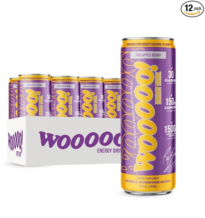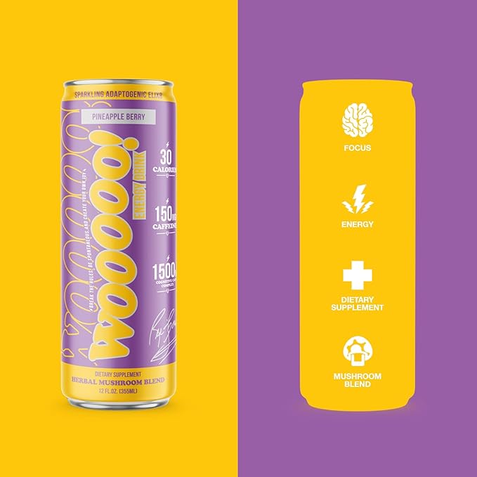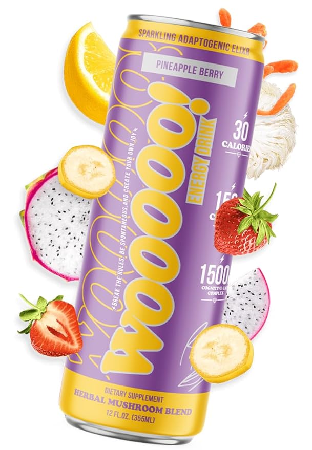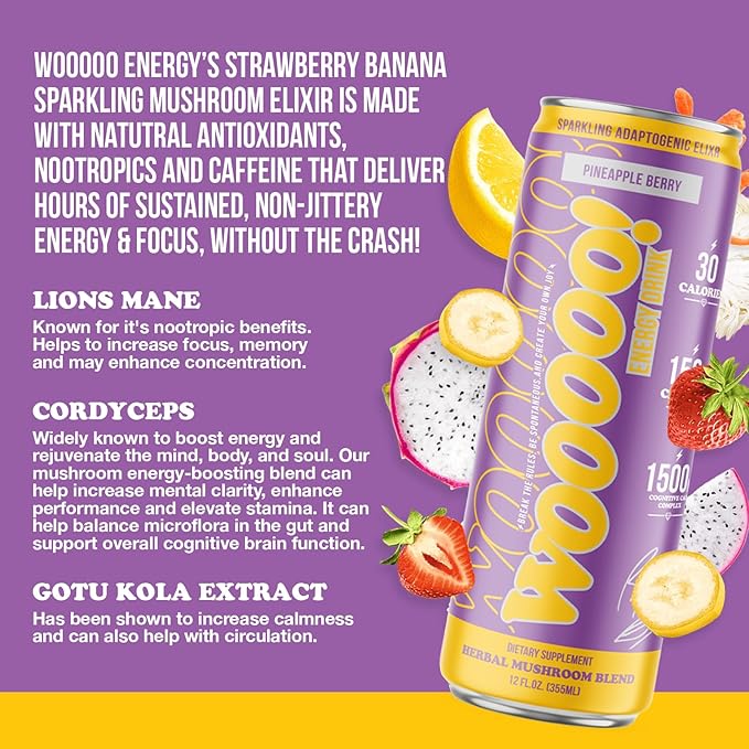 - FEEL THE WOOOOO!: Experience a powerful blend of proven ingredients that will put the WOOOOO in your day! WOOOOO Energy’s Sparkling Mushroom Elixir is made with natural antioxidants, nootropics and caffeine that deliver hours of sustained, non-Jittery energy & Focus but WITHOUT THE CRASH!