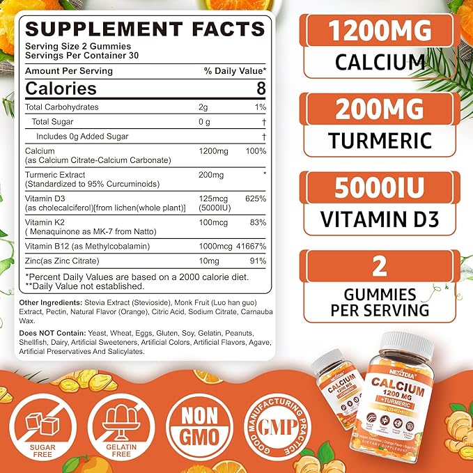 Calcium 1200 mg with Vitamin D3 Gummies - Calcium + Turmeric Supplement for Women and Men with Vitamin K2 B12 - Support Bone & Muscle - Sugar Free - Vegan (120 Count)