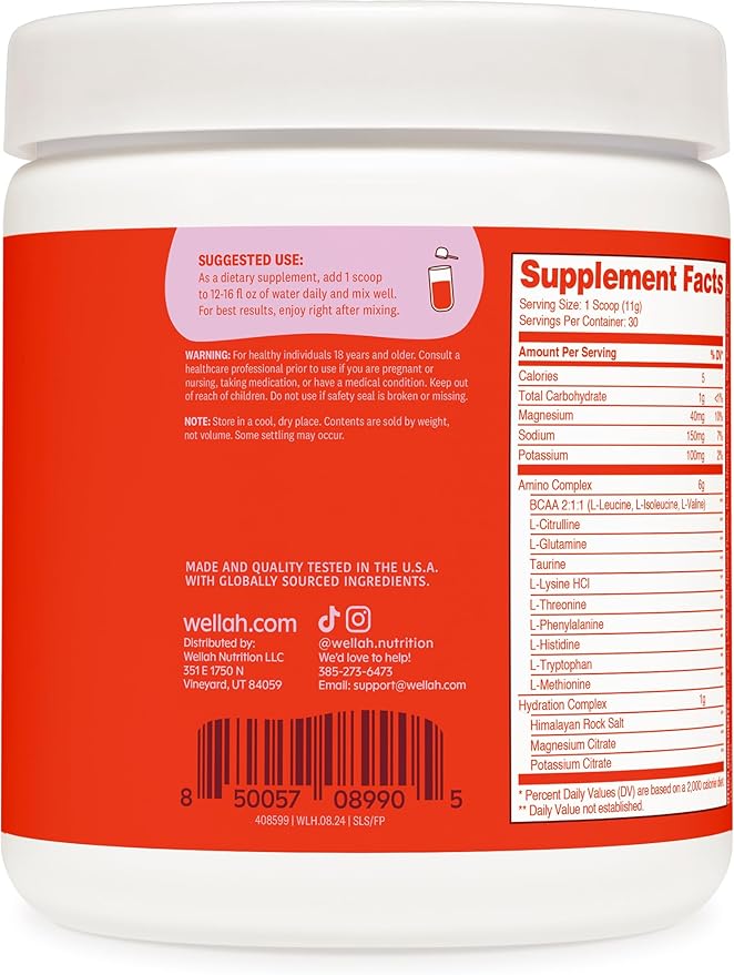 Wellah So Long Soreness BCAA Powder (Fruit Punch Flavored) 30 Servings - with Hydration Complex
