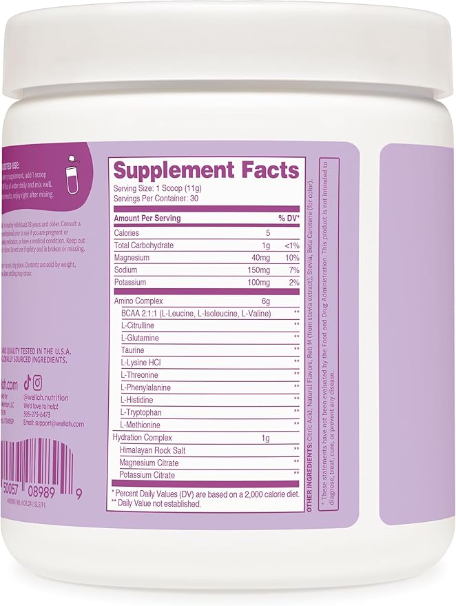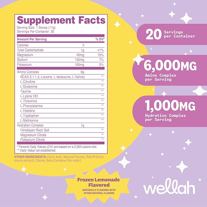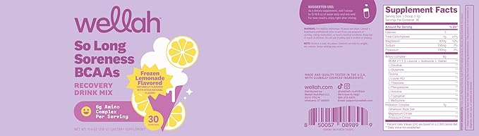 Wellah So Long Soreness BCAA Powder (Frozen Lemonade Flavored) 30 Servings - with Hydration Complex