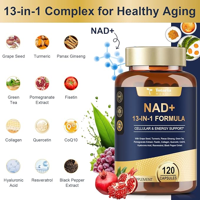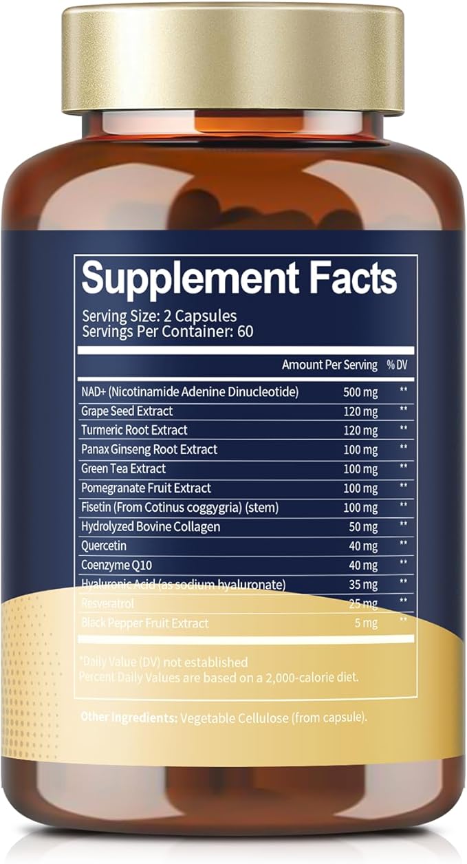 - POWERHOUSE BLEND OF NATURAL INGREDIENTS: Discover the ultimate synergy of 13 scientifically selected natural extracts in our NAD supplement capsules. Each serving is a potent fusion of Grape Seed, Turmeric, Panax Ginseng, Green Tea, Pomegranate Extract, Fisetin, Collagen, Quercetin, CoQ10, Hyaluronic Acid, Resveratrol, and Black Pepper Extract. This comprehensive formula supports cellular health, immune function, and promotes radiant skin, making it the ultimate choice for a holistic wellness approach.
