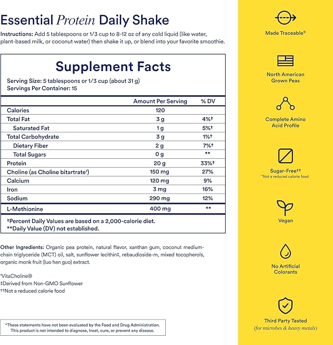 - MADE TRACEABLE: Our world-class scientists scoured the globe for high quality ingredients when formulating Essential Protein Daily Shake 18+. Our plant-based formula includes pea protein from regeneratively farmed peas grown in the USA to help from lean muscle and support recovery, and Choline from Missouri, made using nature-identical tartaric acid for brain support.*