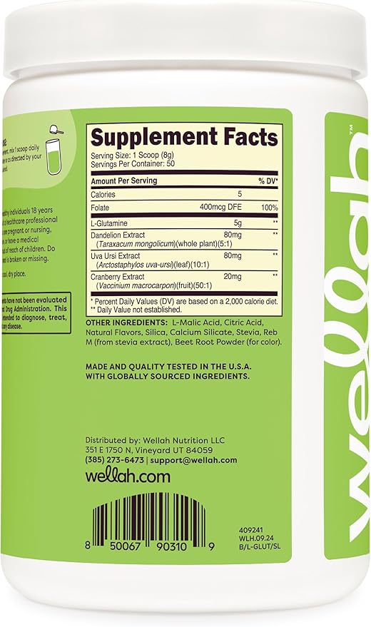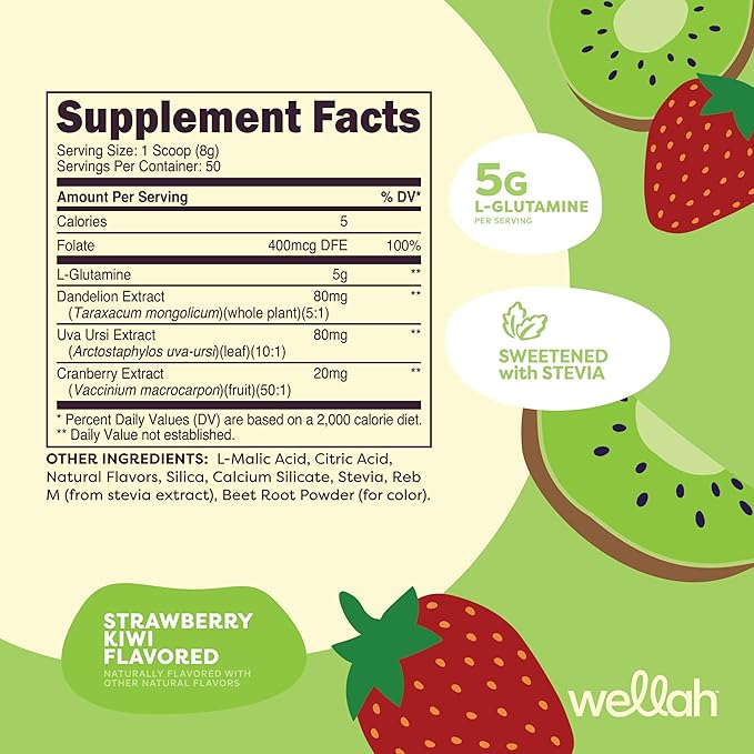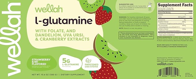 Wellah L-Glutamine Powder Strawberry Kiwi (50 Servings) - 5g L-Glutamine Per Serving, Sweetened with Stevia
