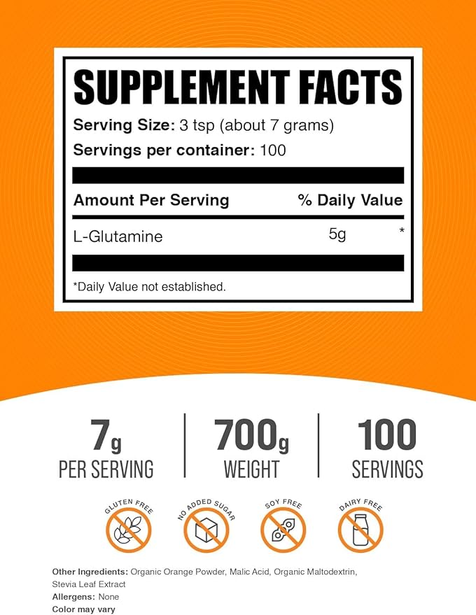 - Optimized in every Serving: Our L-Glutamine flavored powder, in Orange Smash flavor, is free of unnecessary allergens, offering you a high-quality product that easily integrates with other supplements or your preferred shake or beverage.