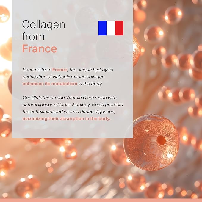 - REVOLUTIONARY TRIPLE ACTION FORMULA: Experience the synergy of 85% pure American Liposomal Glutathione, Naticol French Marine Collagen, and Liposomal Vitamin C. This powerful combination enhances skin radiance, supports detox, and boosts antioxidant protection.
