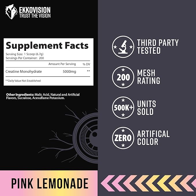 - REFRESHING PINK LEMONADE FLAVOR FOR A TASTY EXPERIENCE: Ekkovision Creatine is now available in a vibrant Pink Lemonade flavor, delivering a tangy and refreshing twist to your fitness routine. Perfect for those who prefer a flavorful option, this creatine powder dissolves smoothly and mixes easily, making every sip a delight while supporting your active lifestyle.