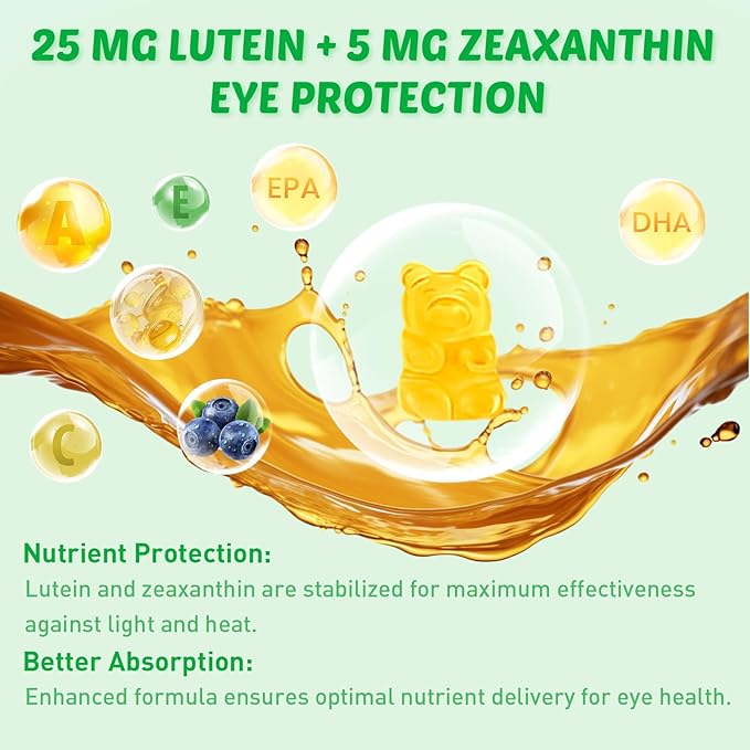 - Complete Eye Vitamins for Vision:Packed with key vitamins like A, C, D3, and E, plus Omega-3s (EPA & DHA), Bilberry, and Astaxanthin, these lutein gummies deliver comprehensive nutrition to maintain healthy vision and improve eye comfort.