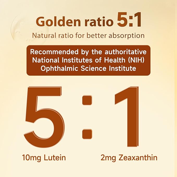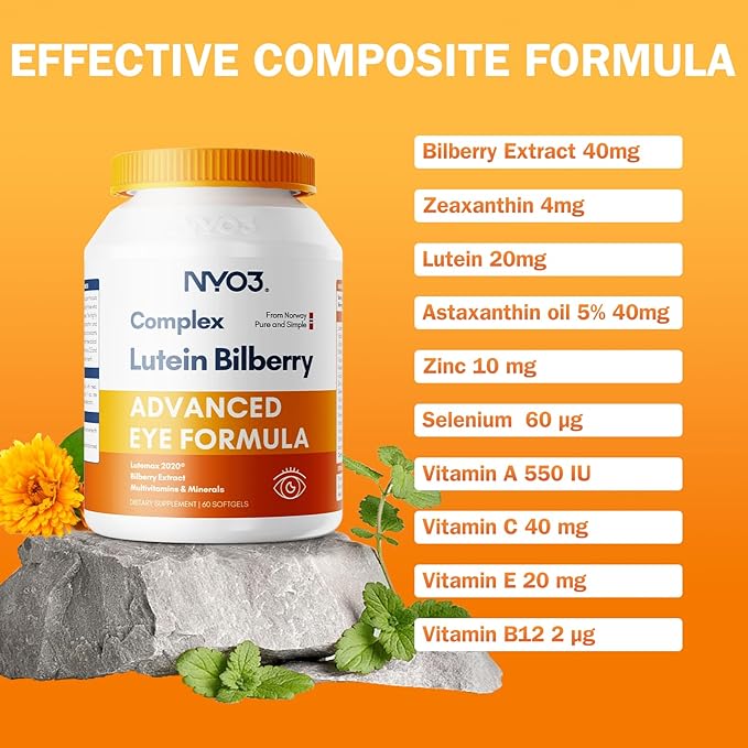- Patented and Certified Lutein: NYO3 features the European patented formula Lutemax 2020, which adopts a 5:1 golden ingredient ratio and has received authoritative recommendation from the National Eye Institute (NIH). Clinically Tested, help filter harmful blue light and protect the retina from oxidative stress.
