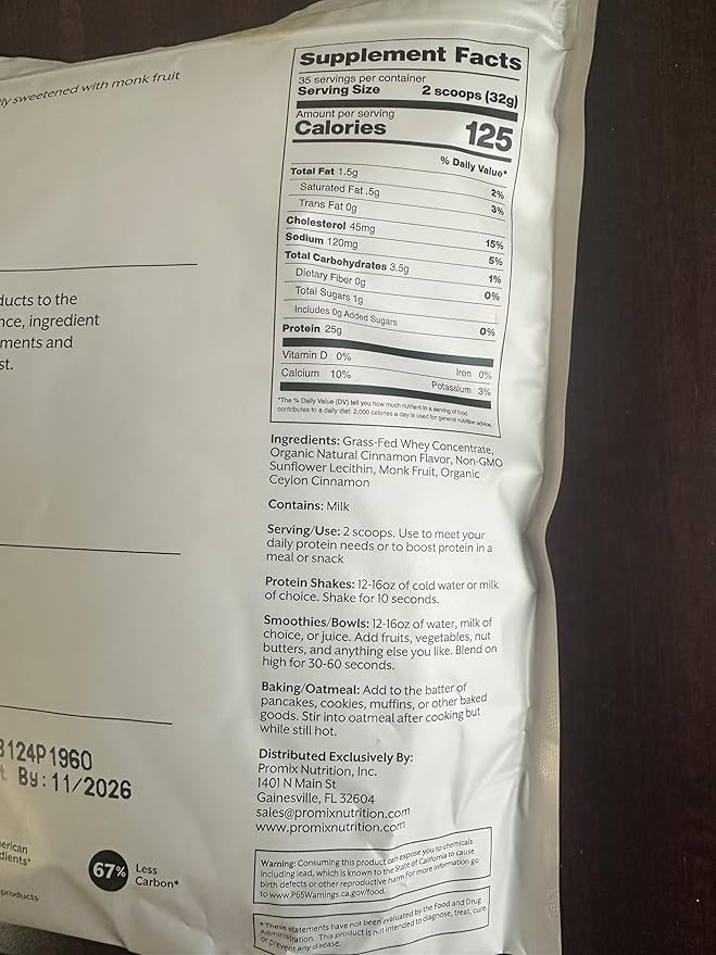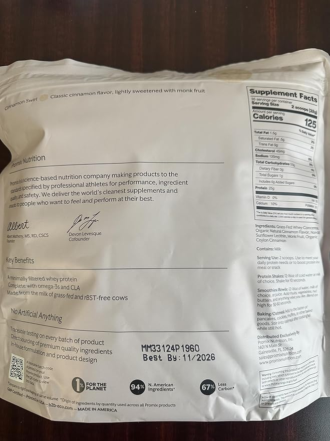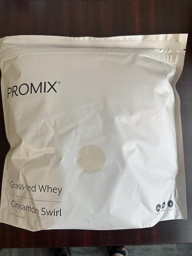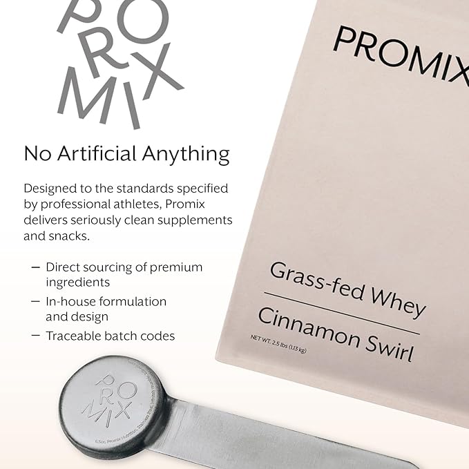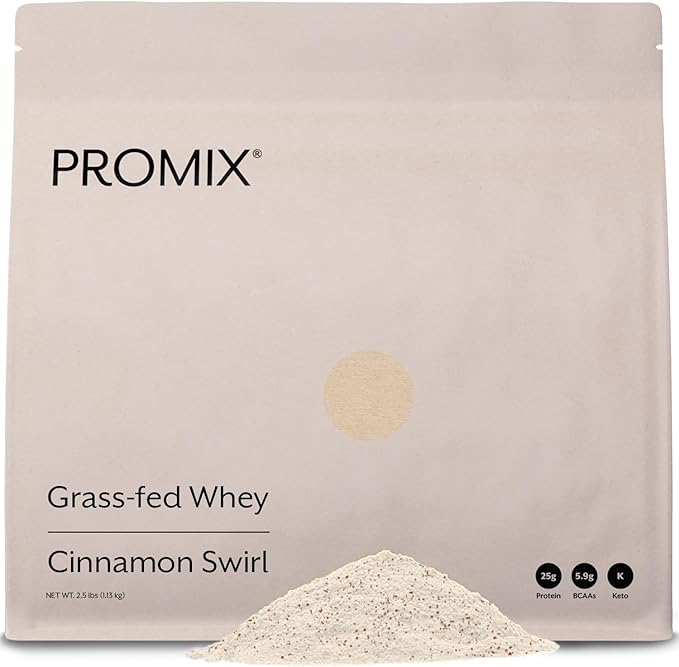 - Build Muscle and Improve Recovery: Promix Whey Protein Powder is a cold-processed and acid-free bioactive native whey made from milk of grass-fed cows. This lightly sweetened, smooth powder contains naturally occurring glutathione and immunoglobulins, as well as sunflower lecithin for improved absorption and blending. Cinnamon Swirl flavor. 33 servings per container, 2 scoops per serving.