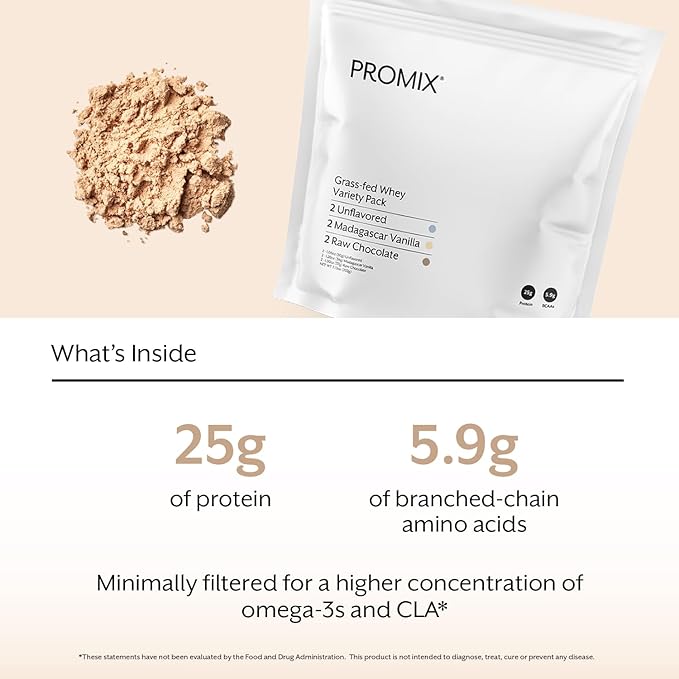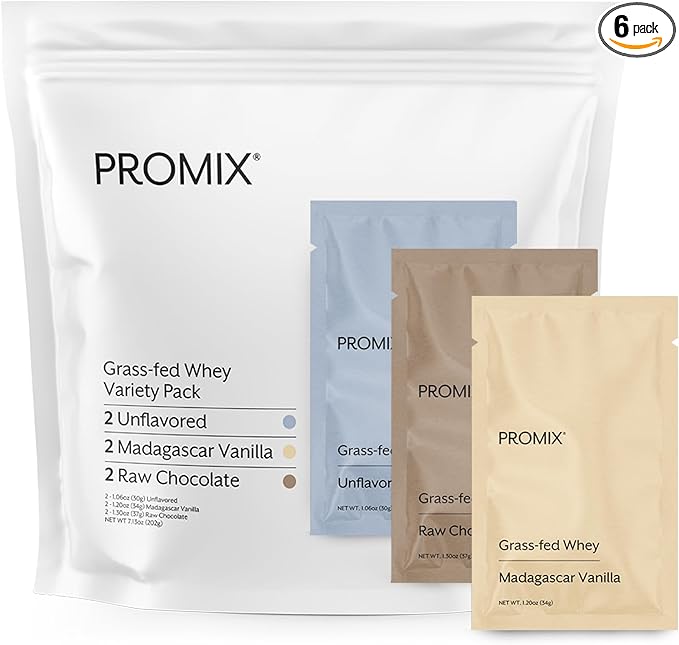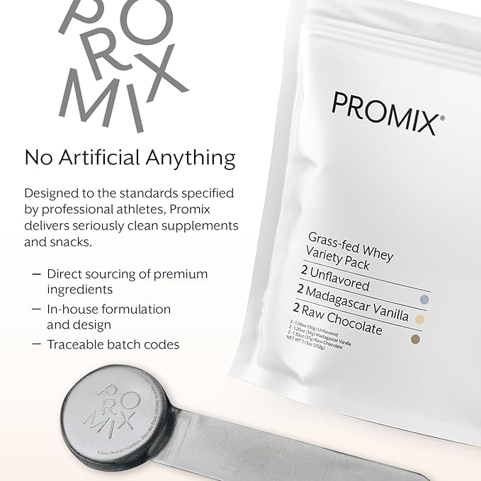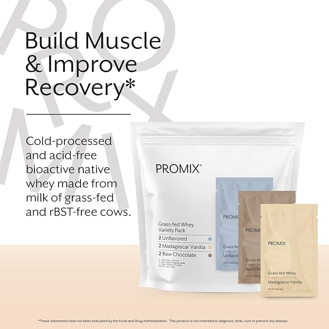 - Build Muscle and Improve Recovery: Promix Whey Protein Powder is a cold-processed and acid-free bioactive native whey made from milk of grass-fed cows. This lightly sweetened, smooth powder contains naturally occurring glutathione and immunoglobulins, as well as sunflower lecithin for improved absorption and blending. Variety Pack (Unflavored, Vanilla, & Chocolate Flavors)