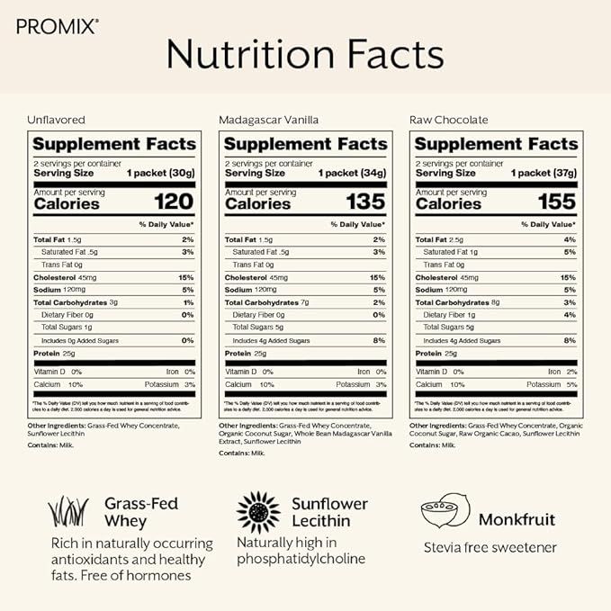 Promix Whey Protein Powder, Variety Pack (Unflavored, Vanilla, & Chocolate Flavors) Grass-Fed & 100% All Natural - Post Workout Fitness & Nutrition Shakes, Smoothies, Baking & Cooking Recipes