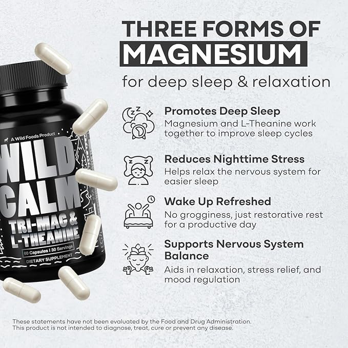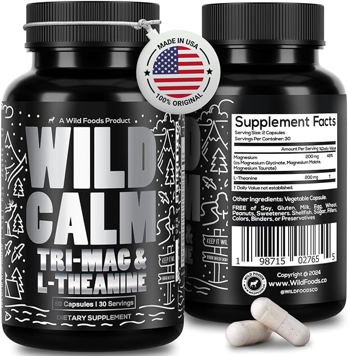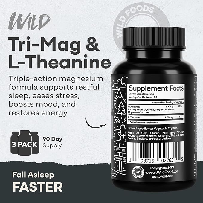 Wild Foods Tri-Mag & L-Theanine – Triple Magnesium Complex for Sleep w/L Theanine – Magnesium Glycinate, Malate, Taurate – 100% Natural – 60 Capsules