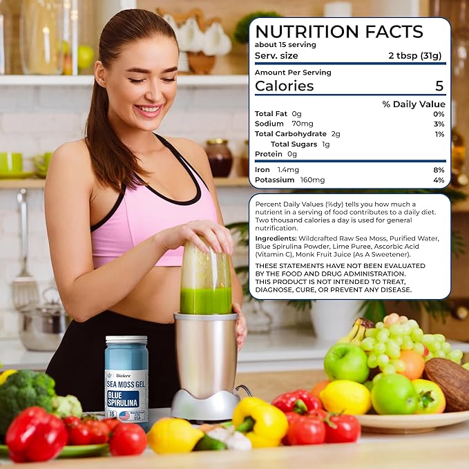 Biolore Sea Moss Gel - Blue Spirulina 16oz, Wildcrafted Irish Seamoss with Essential Vitamins & Trace Minerals, Vegan Superfood Made in USA