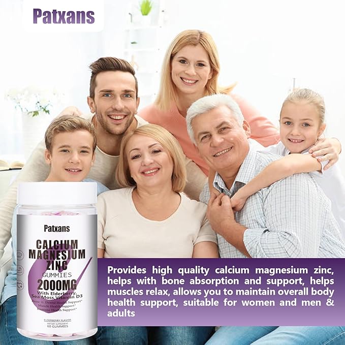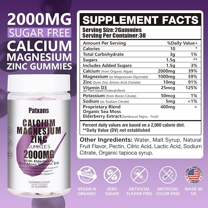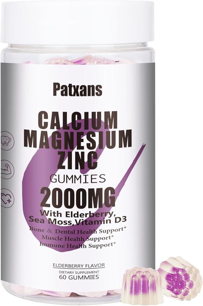 - Why Choose Patxans : Each Patxans calcium magnesium zinc gummies contains 2000mg calcium, 1000mg magnesium, 10mg zinc, 25mcg vitamin D3, 50mcg Potassium, 5mg Sodium, 400mg Proprietary Blend Organic Sea Moss Elderberry Extractd are an easy to take gummy suitable for women,men&,adult. Patxans supplements gummies are pectin-based. And it's pectin-based. You can incorporate them into your daily life.