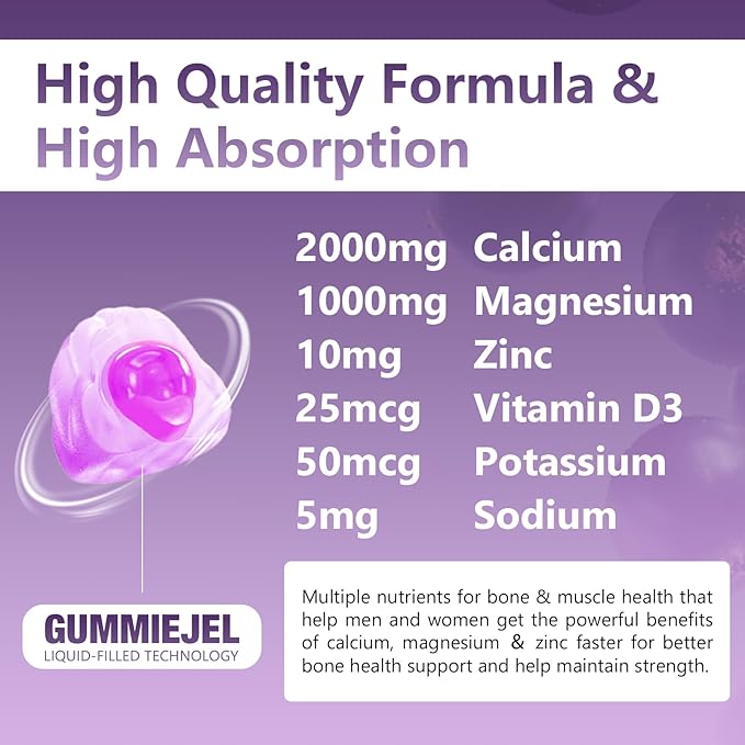 - Enhanced Absorption with Liquid Filled Gummies: Patxans 2000mg calcium, magnesium and zinc gummies use advanced filling technology with pectin protection in the outer layer and maintain a higher bioavailability of internal nutrients. This unique and advanced technology encapsulates the maximum amount of temperature or ph sensitive active ingredients in the interior. Increased absorption capacity by 5 times compared to other traditional calcium, magnesium and zinc supplements.