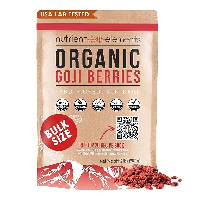 2lbs/32oz Premium Organic, Raw & Dried Goji Berries by Nutrient Elements. USDA Certified. Natural Superfood. Extra Large, Non-GMO Berries with Resealable Bag. Includes Free Recipes E-Book