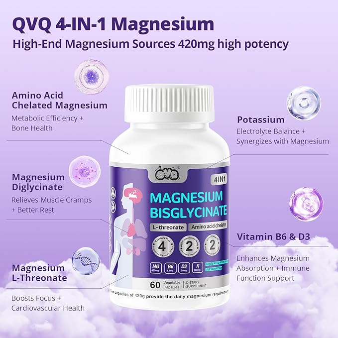 - QVQ magnesium glycinate supplements a variety of high-quality magnesium sources - magnesium amino acid chelated, magnesium bisglycinate, magnesium L-threonate and high-purity pharmaceutical grade magnesium oxide.Unlock the power of our Magnesium Complex, a comprehensive magnesium supplements with the 4 in 1 blend to help support Sleep , Muscle relaxation and Bone health, as well as boosting energy and reducing fatigue.