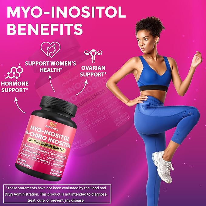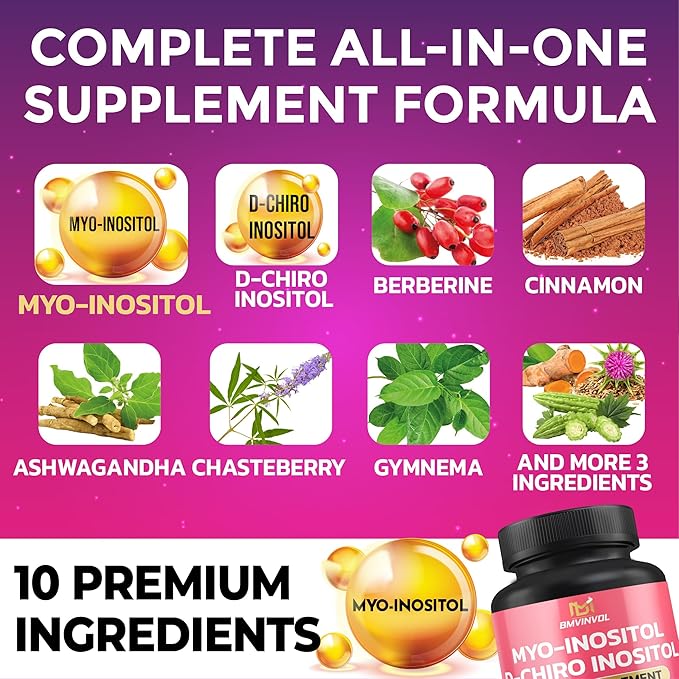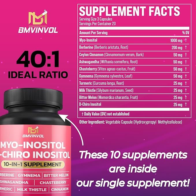 BMVINVOL Inositol Supplement - Myo-Inositol and D-Chiro Inositol Ideal 40:1 Ratio - Plus Berberine, Cinnamon, Ashwagandha + 5 More - 60 Capsules