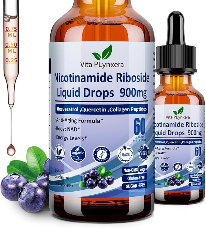 - FOR LONG-TIME USE: This high potency NAD supplement NR900 supplement liquid is 60ml capacity. 30-days supply. NAD liquid Supplement for better absorption by your body. With daily dose of our Nicotinamide Riboside NR900, Resveratrol, Quercetin, Niacin, Collagen, and Biotin Liquid Drops, you'll get a unique blend that supports healthy skin aging, energy production, focus and longevity